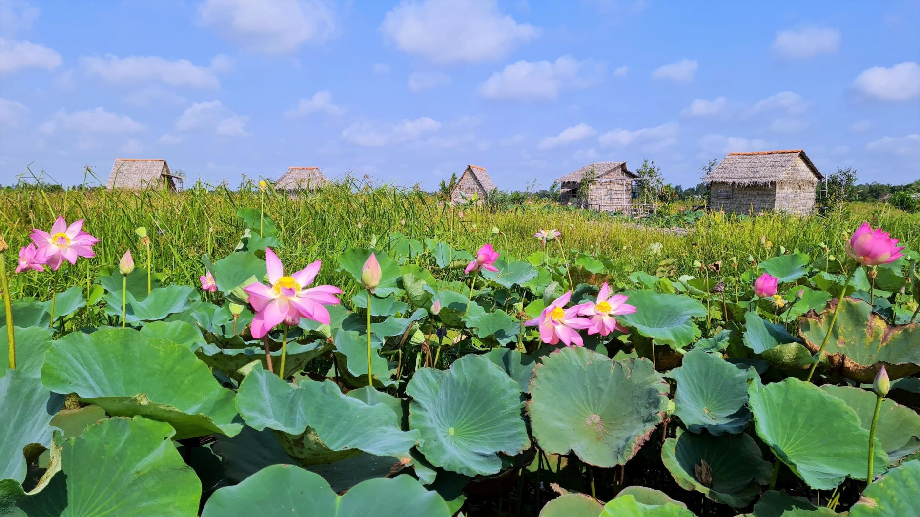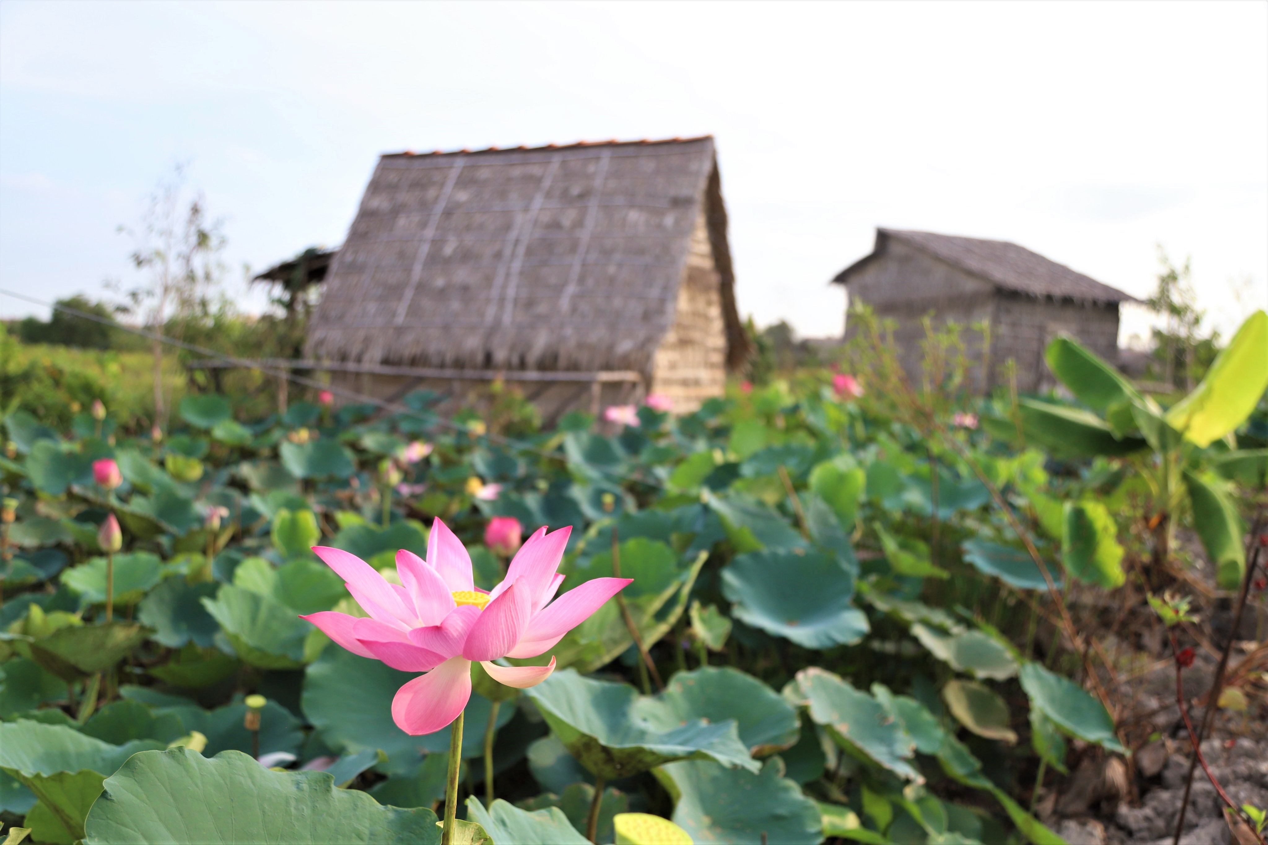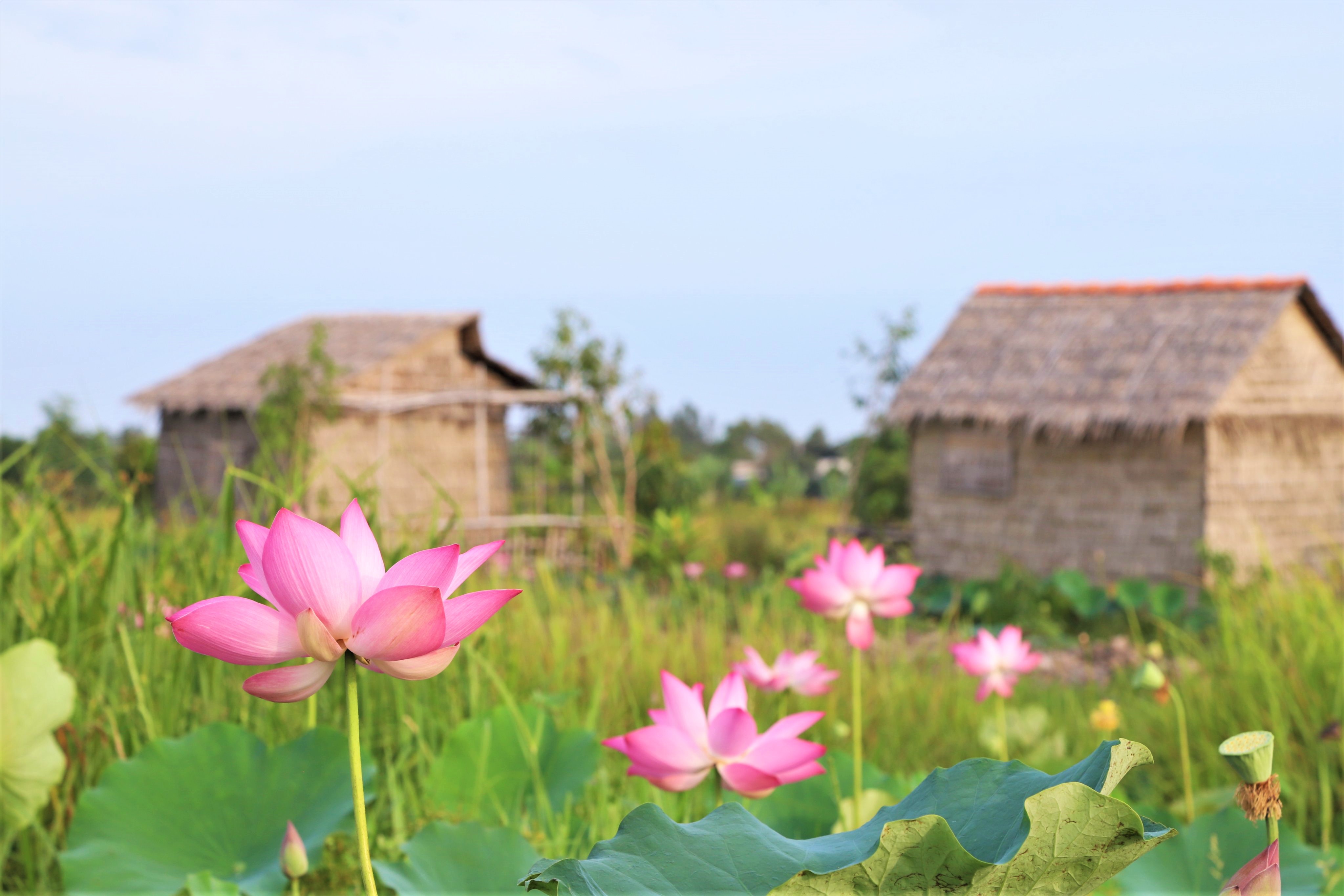 Những cái bungalow xinh xinh trên dòng kênh sen hồng thơ mộng và đầy thú vị, sen tỏa hương trong nắng sớm