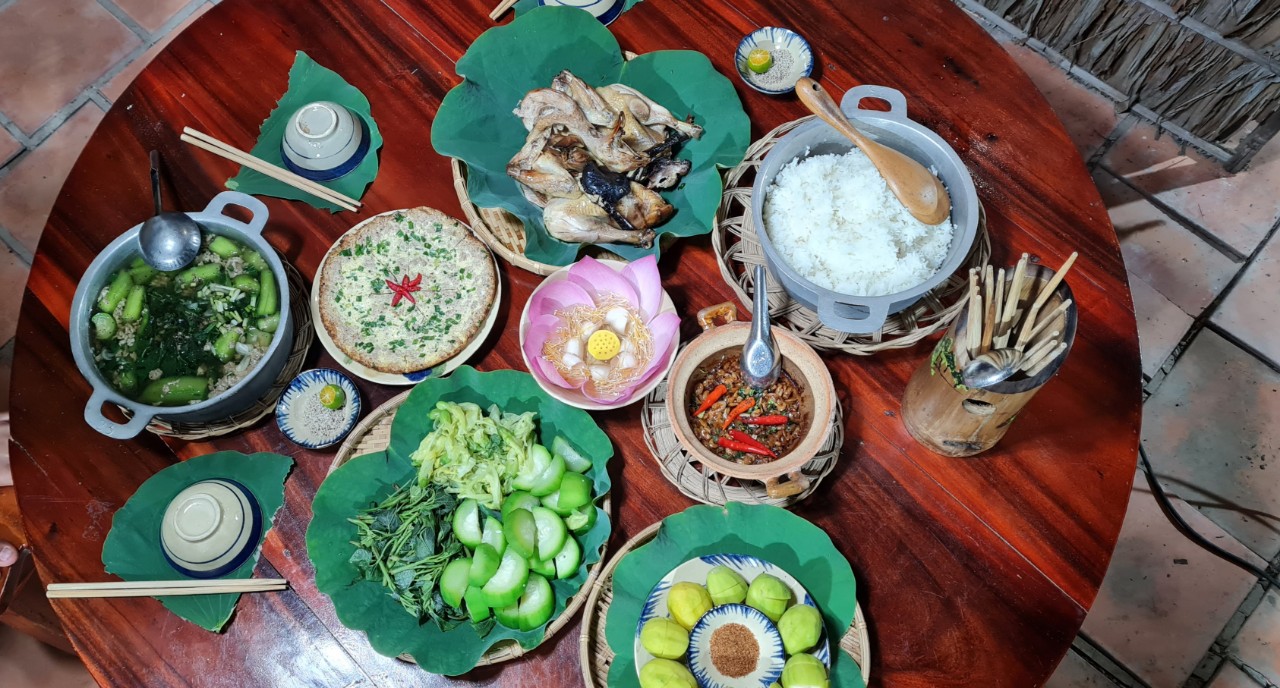 - Các buổi ăn chính và ăn phụ trong ngày (Ăn theo ẩm thực địa phương do nông trại sản xuất hướng về giá trị truyền thống Nam bộ, thực dưỡng, an lành không hóa học với các loại đạm 0,1,2 chân (Gạo hữu cơ ST24 – Top 3 thế giới, Rau sạch, cá da trơn, trái cây, trứng vịt, gà vườn... hạn chế và đạm 04 chân: heo, bò…).