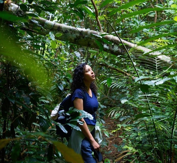 Travel Blogger Nhị Đặng trong chuyến "tắm rừng" ở VQG Cát Tiên. Ảnh: Tan Phat Bui